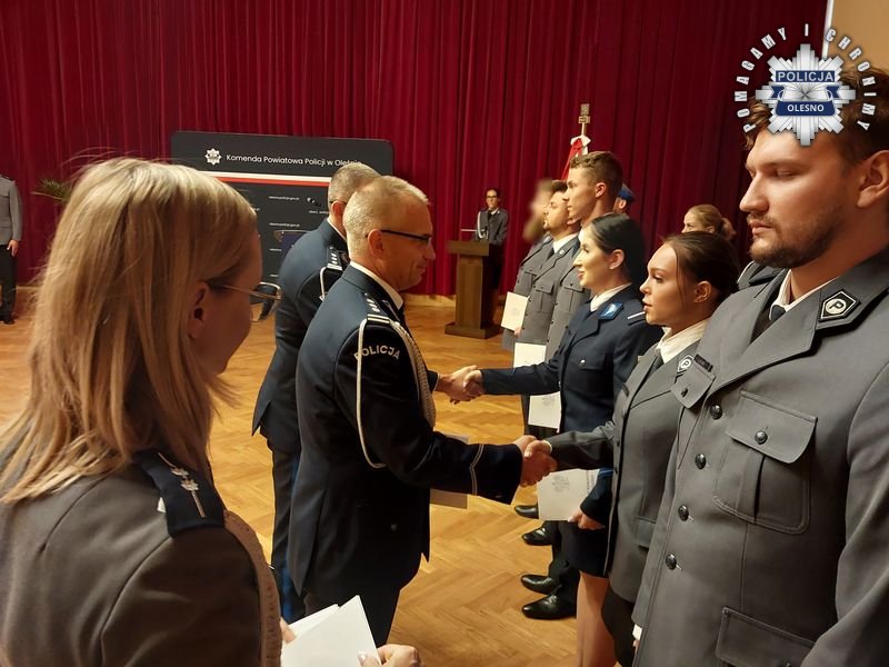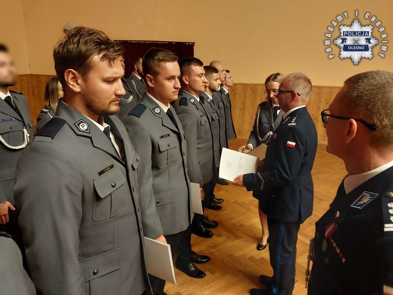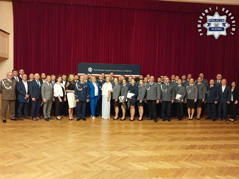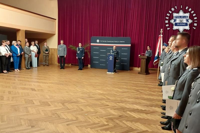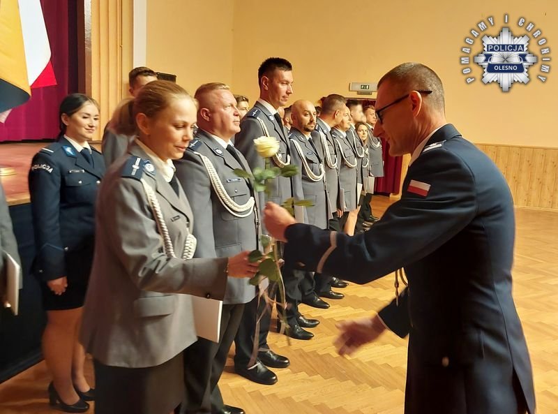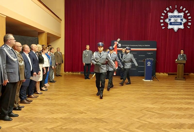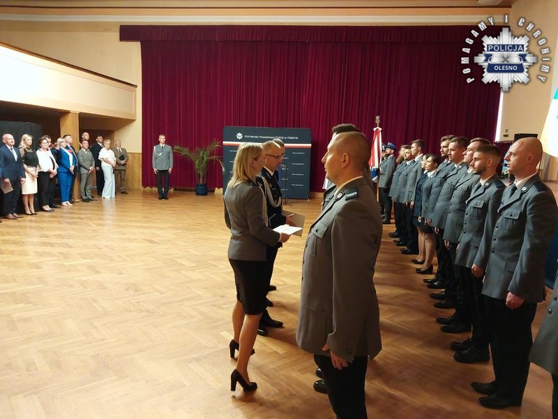Po nabożeństwie uroczystość przeniosła się do Miejskiego Domu Kultury w Oleśnie, gdzie odbyła się uroczysta zbiórka, poprzedzona krótkim opisem historycznym w odniesieniu do 100-lecia kobiet w Policji. W trakcie spotkania Pierwszy Zastępca Komendanta Wojewódzkiego Policji w Opolu insp. Krzysztof Buchała, wraz z Komendantem Powiatowym Policji w Oleśnie insp. Pawłem Kolczykiem wręczyli akty mianowania na wyższe stopnie policyjne wyróżnionym funkcjonariuszom. Po wręczeniu nominacji na wyższe stopnie policyjne Komendant Kolczyk uhonorował jubileusz 100-lecia kobiet w Policji, wręczając policjantkom kwiaty. W wydarzeniu uczestniczyli także przedstawiciele lokalnych władz samorządowych i instytucji.