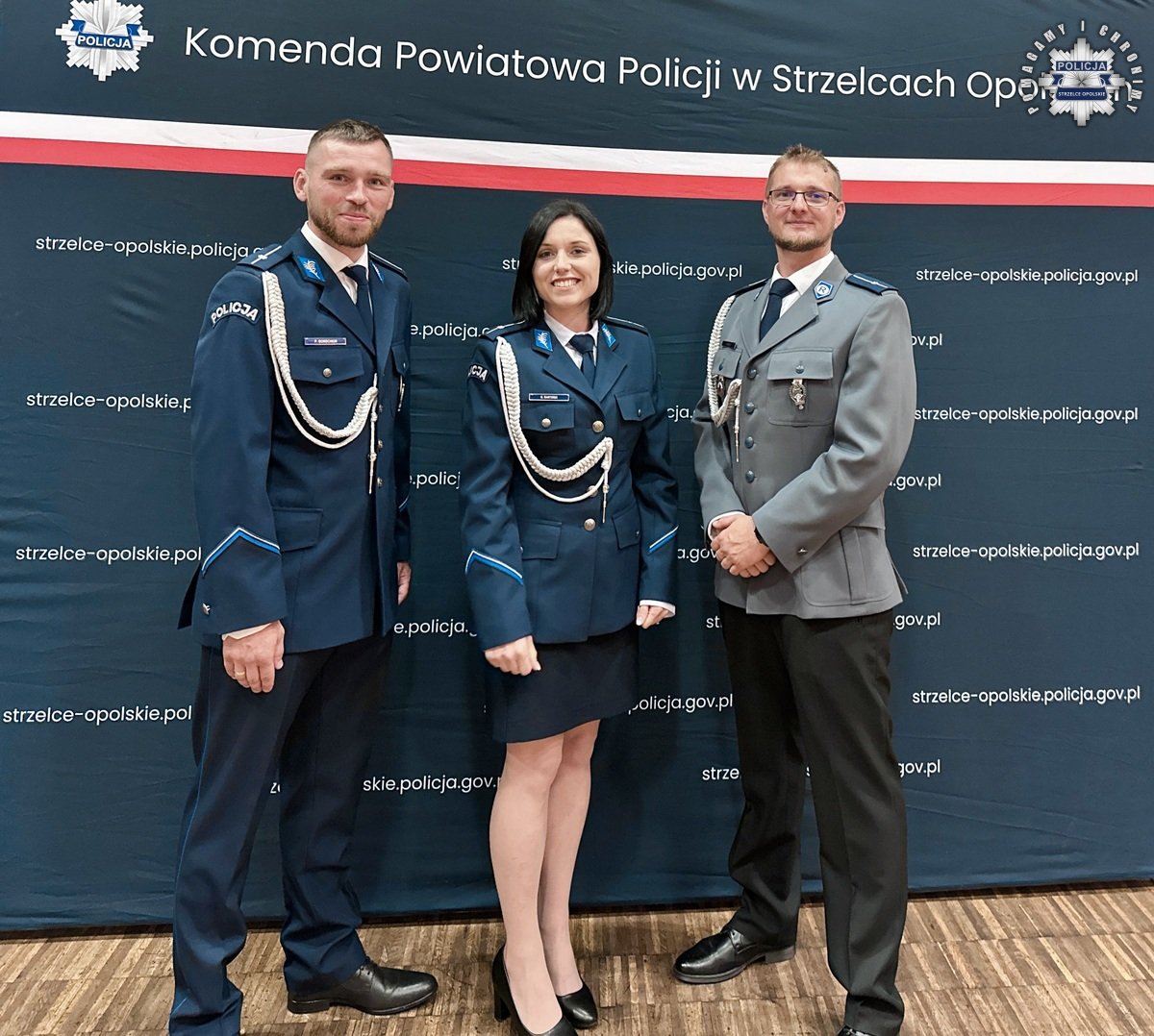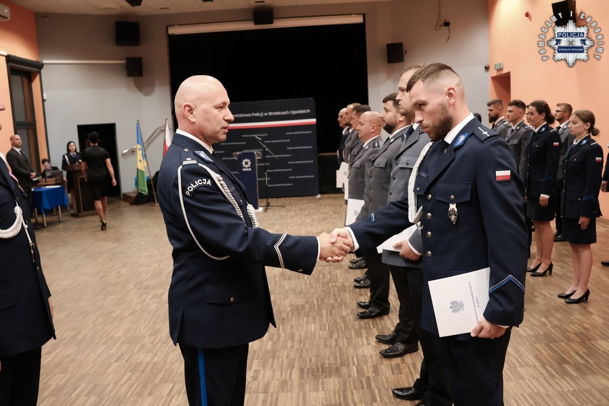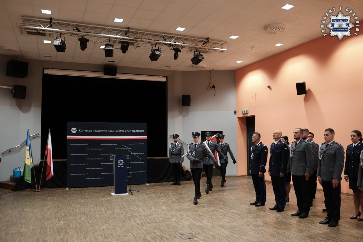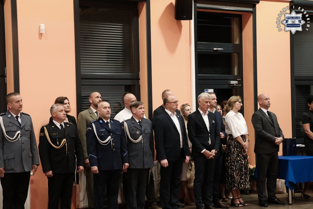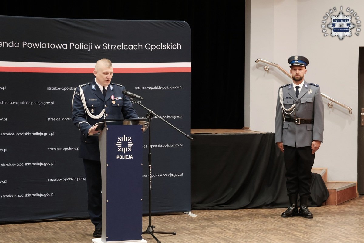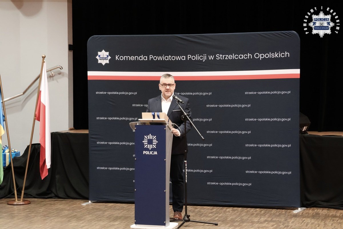 Podczas uroczystych obchodów Święta Policji głos zabrali Zastępca Komendanta Wojewódzkiego Policji oraz Starosta Powiatu Strzeleckiego, wyrażając uznanie dla codziennej służby funkcjonariuszy i pracowników Policji.