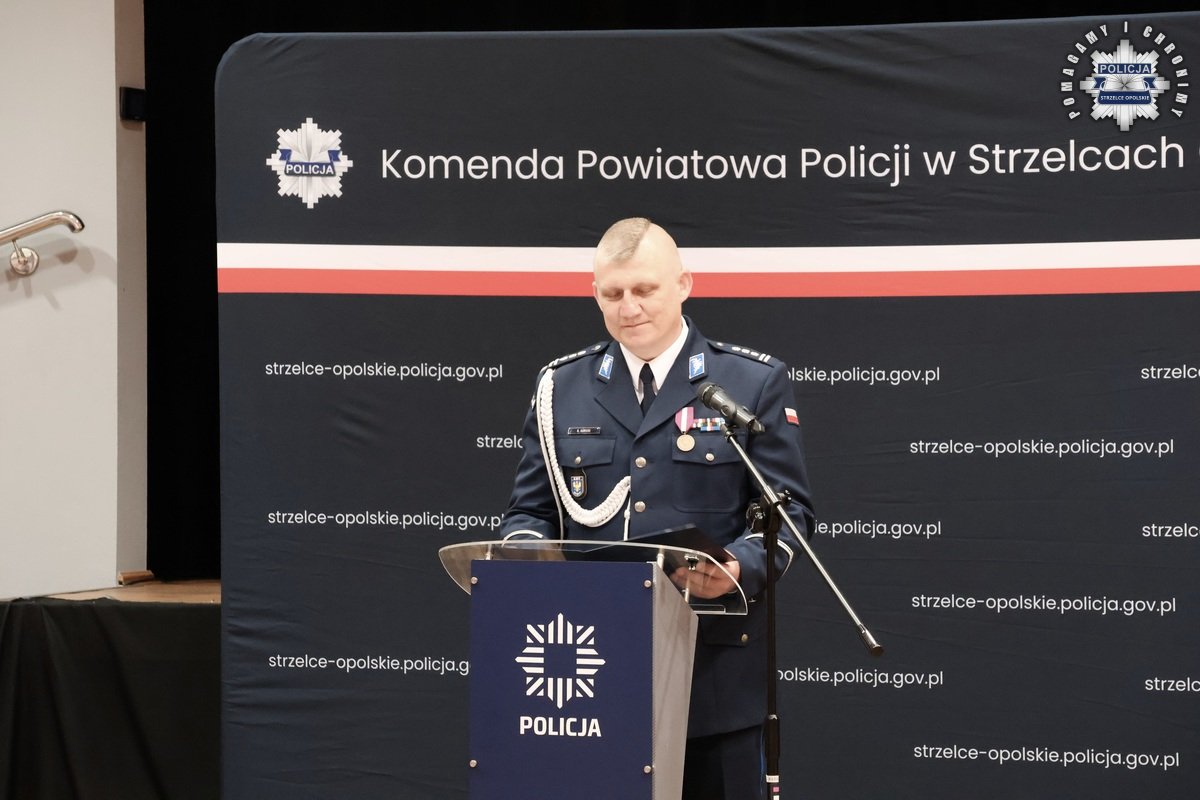 Komendant Powiatowy Policji w Strzelcach Opolskich podinsp. Rafał Lejczak przywitał przybyłych gości i podziękował policjantom za sumienną i pełną oddania służbę. Skierował również ciepłe słowa do bliskich, którzy wspierają funkcjonariuszy w trudnej służbie na rzecz bezpieczeństwa mieszkańców naszego powiatu. Za wsparcie działań na rzecz bezpieczeństwa, słowa podziękowania skierował do Pana Starosty Powiatu Strzeleckiego, Burmistrzów oraz Wójtów strzeleckich gmin.