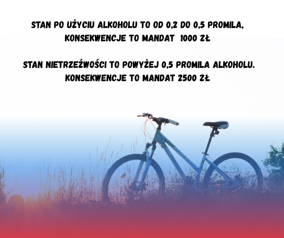 Pamiętajmy, że jazda na rowerze pod wpływem alkoholu nie tylko skutkuje wysokim mandatem, ale może doprowadzić do nieodwracalnych w skutkach tragedii, zarówno dla samego rowerzysty, jak i też innych uczestników ruchu drogowego. Rowerzysta pod wpływem alkoholu, jadący slalomem i nagle wyjeżdżający na drogę lub zmieniający pas ruchu, stanowi realne zagrożenie dla wszystkich kierujących. Dlatego nie ma miejsca na tak niebezpieczne zachowania na drodze.