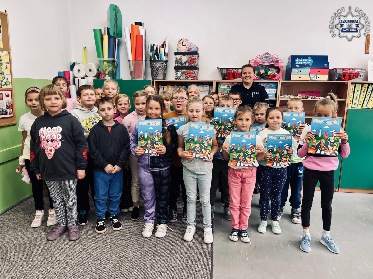 Na pamiątkę i utrwalenie zdobytej wiedzy najmłodsi otrzymali specjalne materiały edukacyjne: pierwszoklasiści książeczki pt. „Pierwszaki”, a przedszkolaki – „Bezpiecznego przedszkolaka”. Kolorowanki, gry i rebusy w atrakcyjny sposób przybliżają podstawowe zasady bezpieczeństwa i uczą dobrych nawyków.