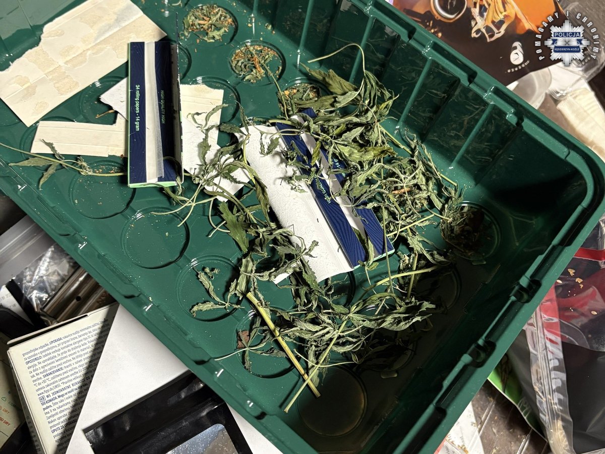Mężczyzna został zatrzymany i trafił do policyjnego aresztu. W toku dalszych czynności kryminalni przeszukali jego miejsce zamieszkania, gdzie ujawnili kolejne narkotyki. Policjanci zabezpieczyli ponad 700 porcji narkotyków: marihuanę, amfetaminę, grzyby halucynogenne oraz nasiona konopi. Ponadto zlikwidowali uprawę konopi innych niż włókniste i zabezpieczyli krzewy tej rośliny, a także sprzęt służący do ich uprawy.