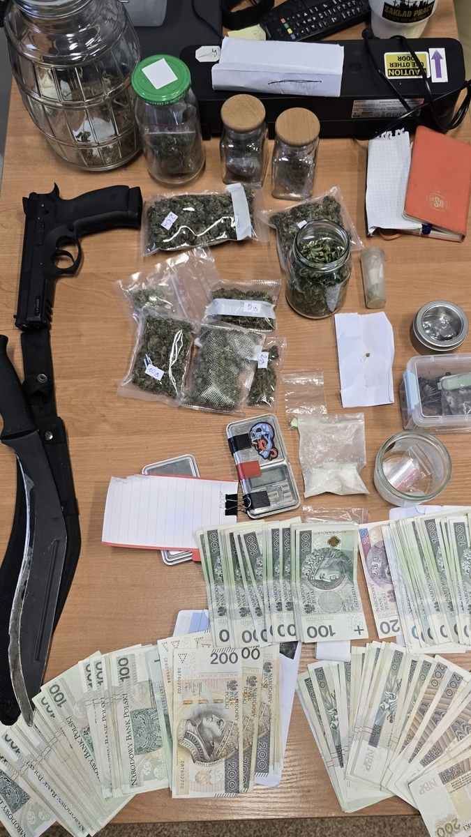 Mężczyzna został zatrzymany i doprowadzony do policyjnego aresztu. W toku dalszych czynności funkcjonariusze przeszukali miejsce jego zamieszkania. W mieszkaniu policjanci ujawnili znaczną ilość narkotyków oraz gotówkę mogącą pochodzić z przestępczego procederu. Zebrany materiał dowodowy pozwolił na przedstawienie mężczyźnie zarzutów posiadania znacznej ilości substancji psychotropowych i środków odurzających. Za posiadanie znacznych ilości środków odurzających podejrzanemu grozi kara do 10 lat pozbawienia wolności.