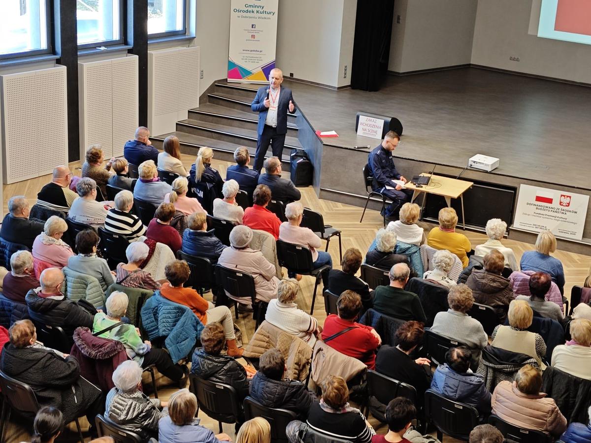 Jako głos pierwszy zabrała podkom. Monika Solich, p.o. Zastępcy Komendanta Komisariatu Policji w Dobrzeniu Wielkim, która omówił sposób działania przestępców podszywających się pod policjantów lub usiłujących wyłudzić pieniądze od seniorów informując ich o wypadkach osób najbliższych oraz omówiła zagrożenia, jakie mogą czyhać na użytkowników Internetu oraz telefonów komórkowych i stacjonarnych.