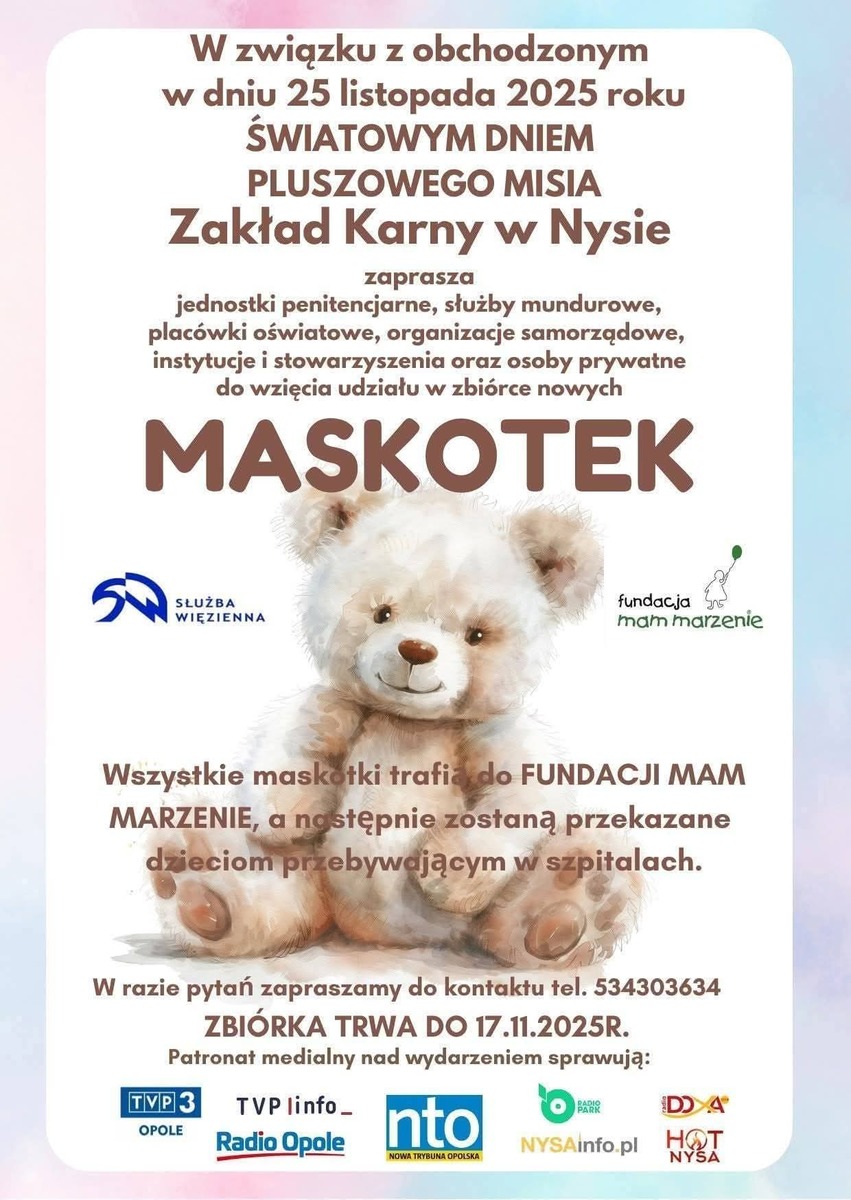Oficjalne przekazanie maskotek funkcjonariuszom Służby Więziennej w Nysie odbyło się w siedzibie komendy Policji. Teraz mundurowi z Nysy zajmą się dostarczeniem zabawek do Fundacji „Mam Marzenie”, która od lat wspiera chore dzieci w całej Polsce. Współpraca służb pozwoliła skutecznie i szybko przekazać pomoc tam, gdzie jest najbardziej potrzebna.