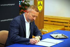 Następnie przystąpiono do podpisania listu intencyjnego, na którym złożyli podpisy przedstawiciele Policji oraz gminy. Zawarte porozumienie stanowi fundament do dalszych działań związanych z budową nowej siedziby Komendy Powiatowej Policji w Namysłowie.