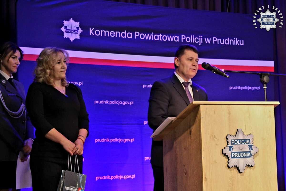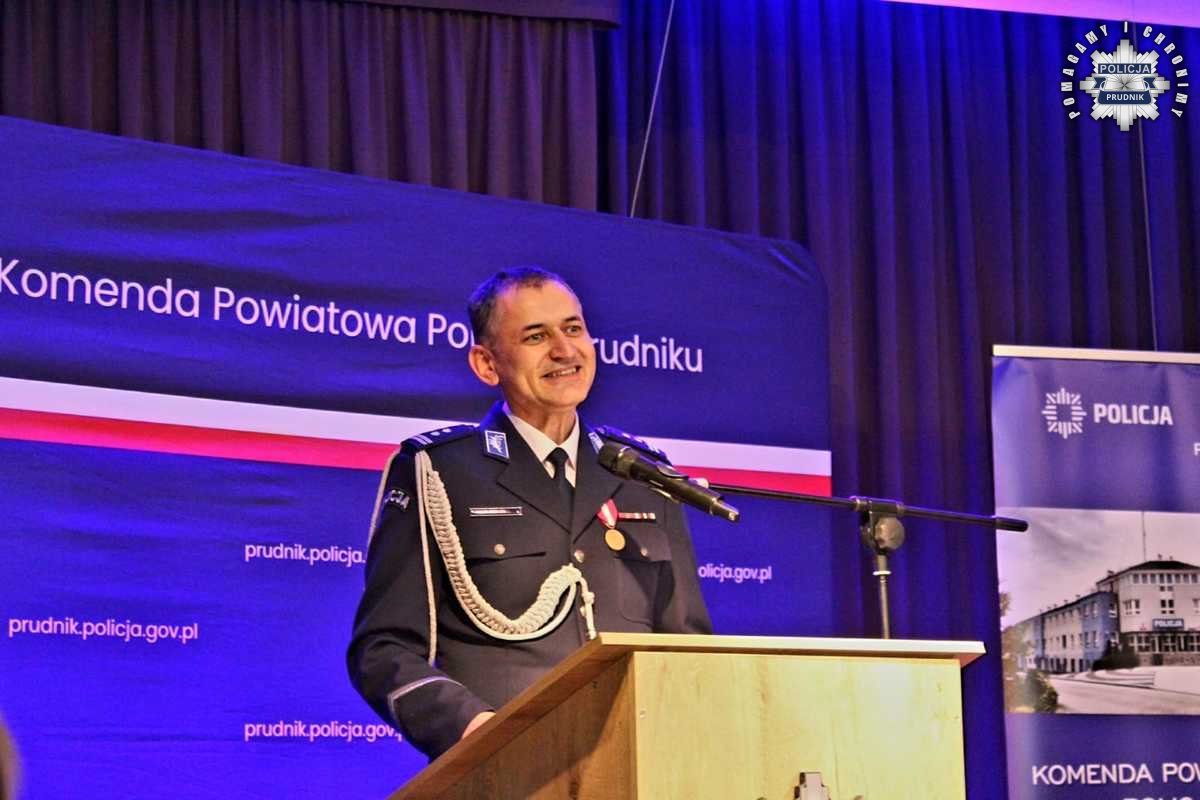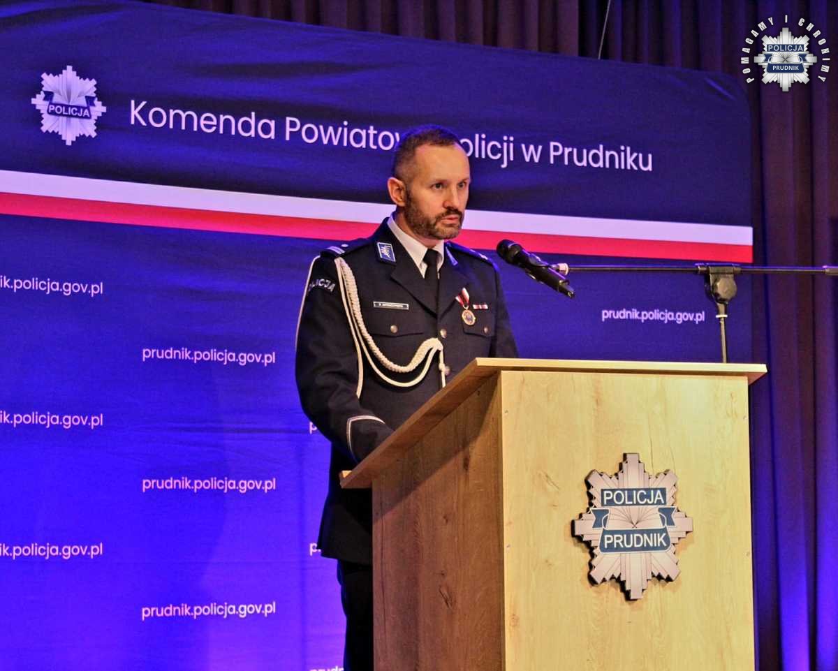 W imieniu Komendanta Wojewódzkiego Policji w Opolu insp. Magdaleny Nguyen-Fudali, insp. Krzysztof Buchała podziękował Komendantowi prudnickiej jednostki za dotychczasową służbę oraz zaangażowanie .