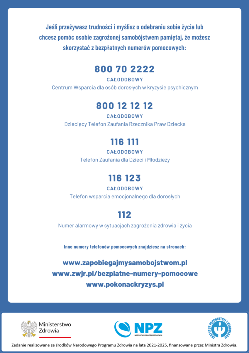 W sytuacjach kryzysowych warto korzystać z pomocy wykwalifikowanych specjalistów. Przypominamy o dostępnych numerach pomocowych: