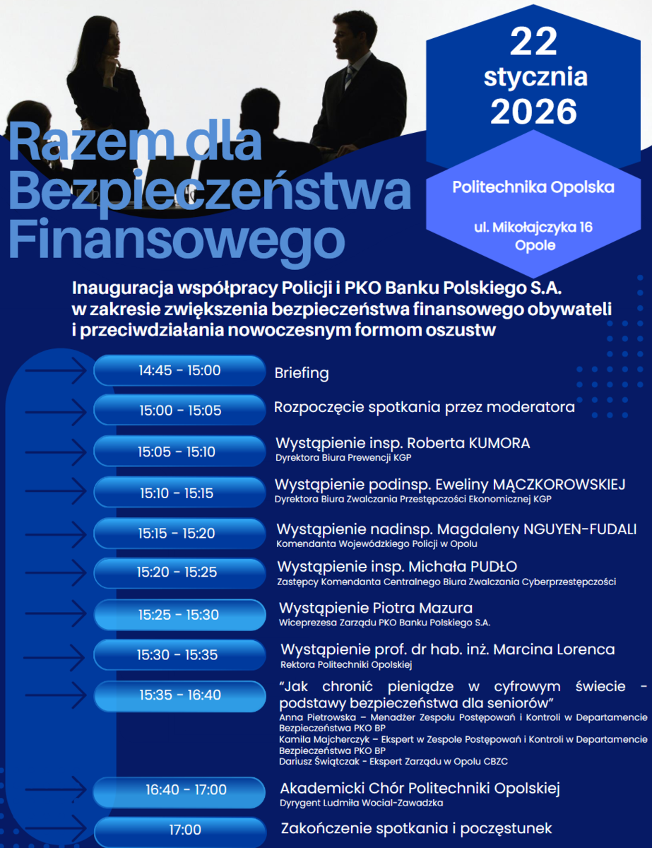 Komenda Główna Policji, we współpracy z PKO Bankiem Polskim S.A., realizuje ogólnopolskie działania edukacyjno-profilaktyczne ukierunkowane na przeciwdziałanie oszustwom finansowym oraz przestępczości wykorzystującej nowoczesne technologie. Inicjatywa stanowi odpowiedź na rosnącą skalę wyłudzeń środków finansowych, danych osobowych oraz dostępu do rachunków bankowych, których ofiarami coraz częściej padają zarówno seniorzy, jak i młodzież. Konferencja odbędzie się 22 stycznia 2026 r. o godz. 15.00 na Politechnice Opolskiej ul. Mikołajczyka 16 w Opolu.