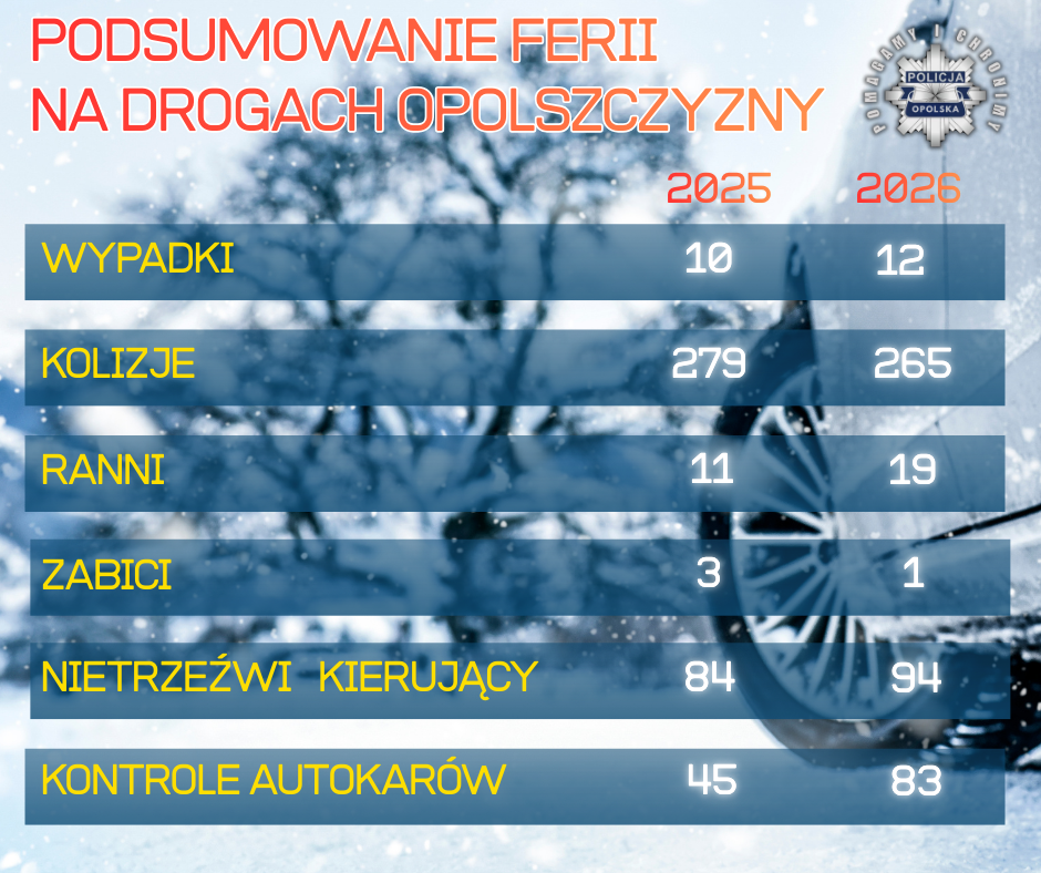 W okresie ferii zimowych, od 31 stycznia do 15 lutego, na drogach Opolszczyzny doszło do 12 wypadków, w których zginęła 1 osoba, a 19 zostało rannych. Ponadto na opolskich drogach doszło do 265 kolizji, a funkcjonariusze zatrzymali 94 kierowców pod wpływem alkoholu, którzy stanowili poważne zagrożenie dla innych uczestników ruchu. Mundurowi podczas ferii skontrolowali ogółem ponad 9300 pojazdów, to w porównaniu do roku ubiegłego o ponad 1300 kontroli więcej. Nie zabrakło także kontroli autobusów przewożących dzieci i młodzież na zimowy wypoczynek – skontrolowano 83 autokary, sprawdzając zarówno ich stan techniczny, jak i trzeźwość kierowców.