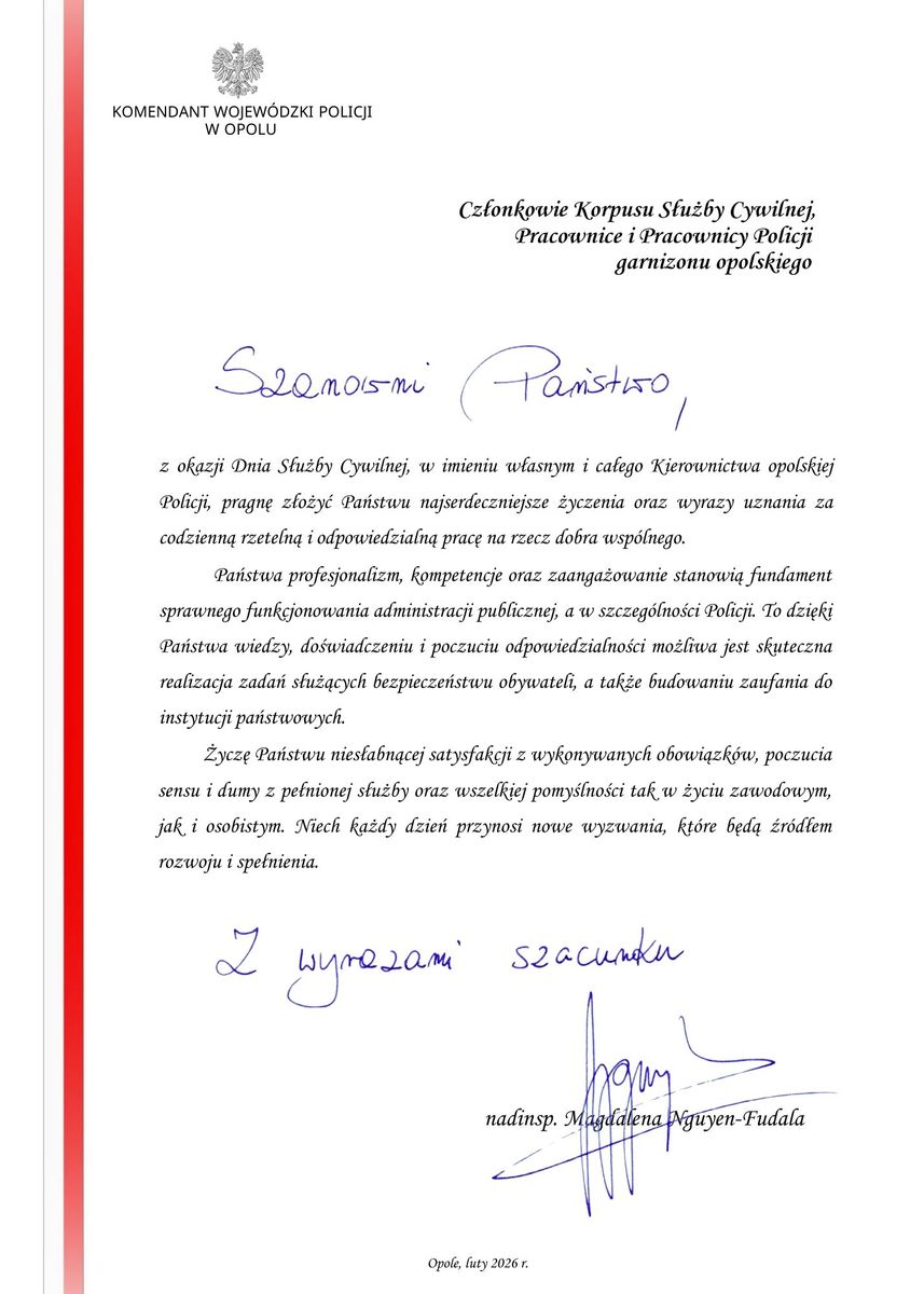 Życzenia Komendanta Wojewódzkiego Policji w Opolu z okazji Dnia Służby Cywilnej