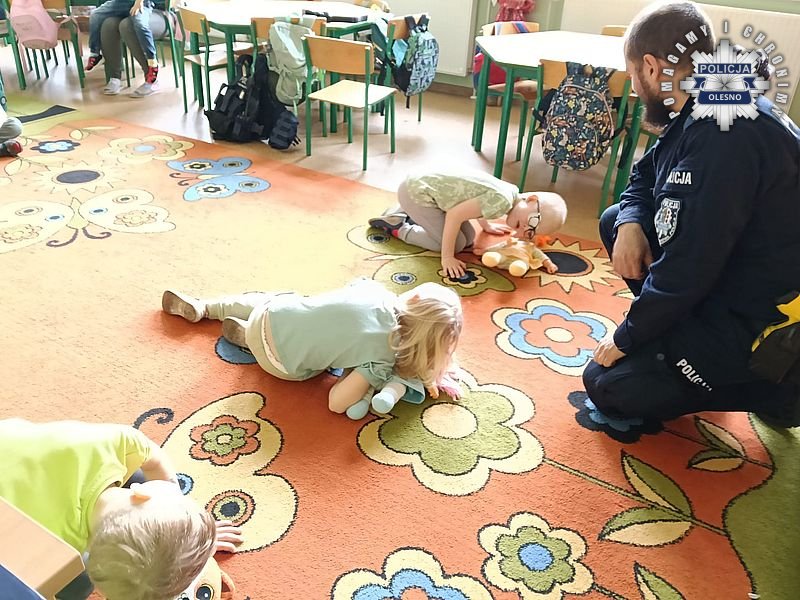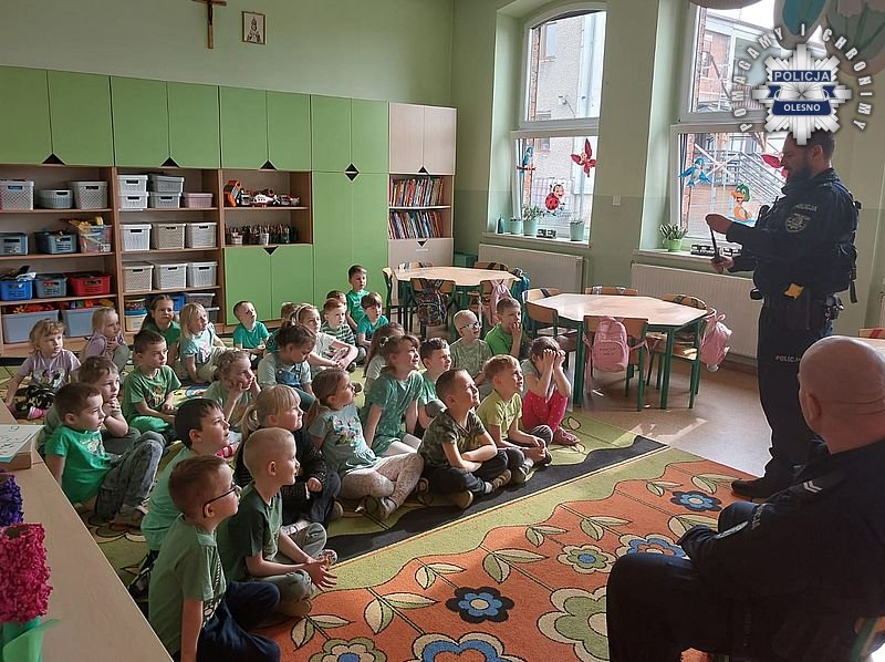 Publiczne Przedszkole w Kościeliskach odwiedzili policjanci z Olesna. Mundurowi spotkali się z najmłodszymi mieszkańcami, aby w radosnej atmosferze porozmawiać o rzeczach niezwykle ważnych. Głównym tematem spotkania było bezpieczeństwo w ruchu drogowym. Dzieci uczyły się, jak należy prawidłowo przechodzić przez jezdnię, dlaczego warto nosić odblaski i jak zachować czujność podczas spacerów. Dodatkowo dzieci miały możliwość poznania elementów wyposażenia indywidualnego funkcjonariuszy.