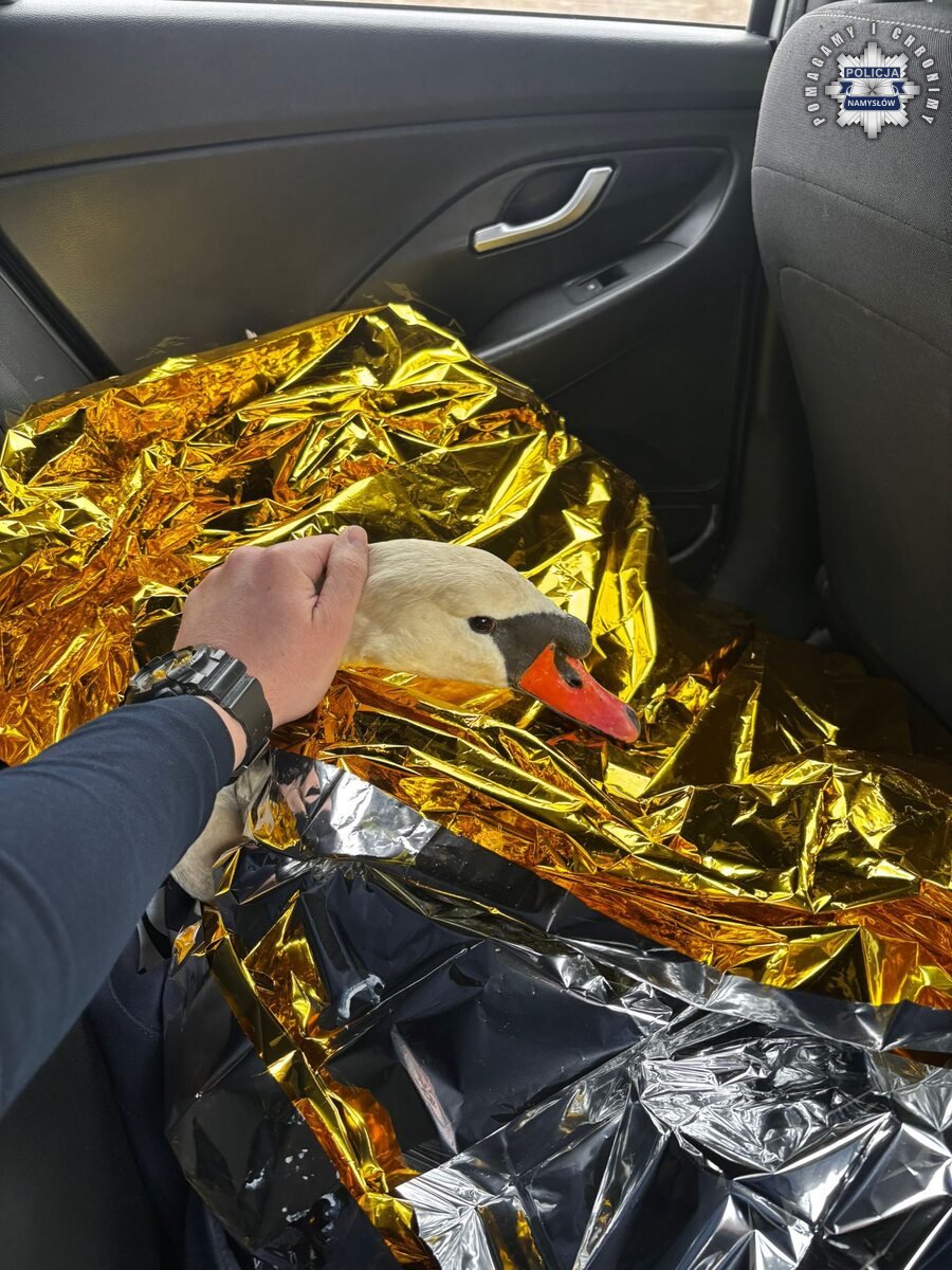 Szybka reakcja policjantów ruchu drogowego pozwoliła uratować rannego łabędzia, który zaplątał się w siatkę ogrodzeniową w pobliżu zabudowań. Zwierzę trafi pod specjalistyczną opiekę weterynaryjną.