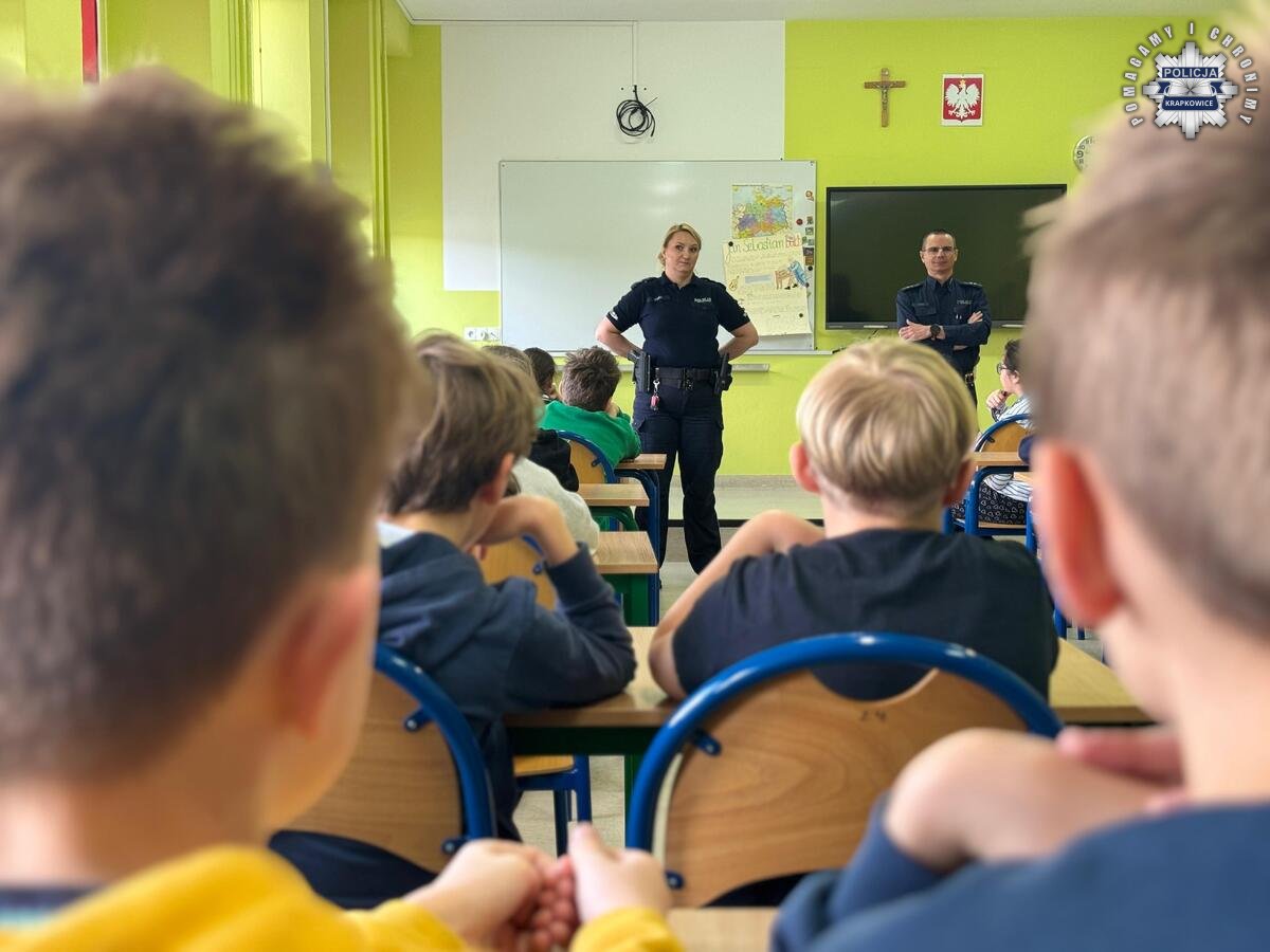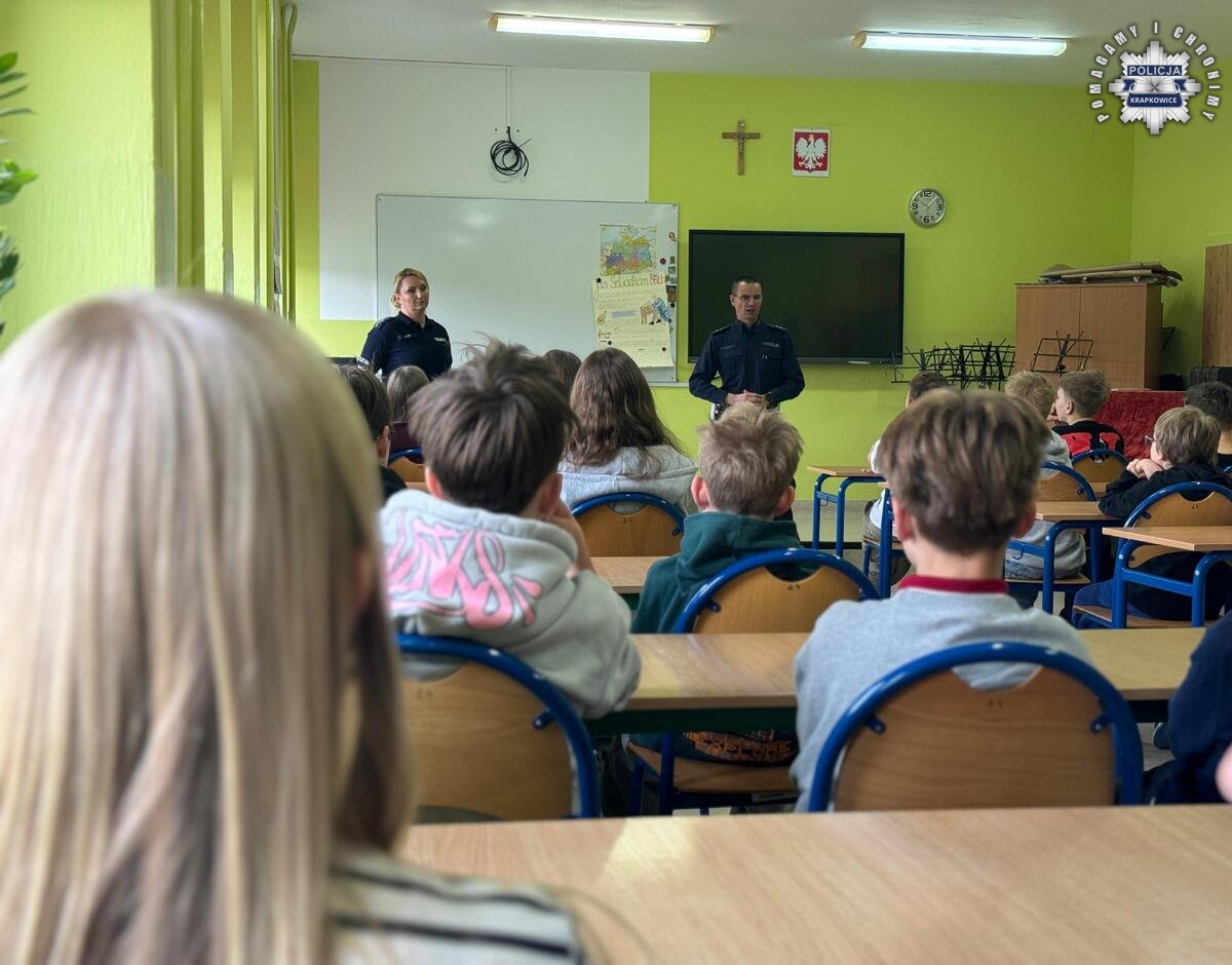Asp. Alicja Sornat oraz asp. Krzysztof Rejman z Komendy Powiatowej Policji w Krapkowicach przeprowadzili spotkania profilaktyczne z uczniami szkół podstawowych, których celem było zwiększenie świadomości dzieci i młodzieży w zakresie bezpieczeństwa w ruchu drogowym oraz odpowiedzialności prawnej osób nieletnich w zakresie nowelizacji niektórych przepisów o kierowaniu hulajnogą elektryczną.