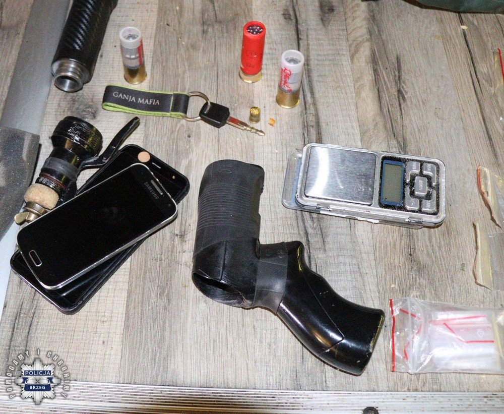 W trakcie wykonywania czynności kryminalni natrafili w mieszkaniu mężczyzny na woreczki strunowe z białą substancją. Część była ukryta w kuchennych szafkach. Pozostałe leżały na wierzchu, a tuż obok nich broń i amunicja. Badanie narkotestem wykazało, że znalezione środki to ponad 600 porcji amfetaminy. Natomiast broń (prawdopodobnie samodzielnie skonstruowana przez mężczyznę) i kilka sztuk amunicji zostały zabezpieczone do badań balistycznych. Ponadto w pomieszczeniu gospodarczym był zaparkowany motorower, który miał przerobione tablice rejestracyjne.