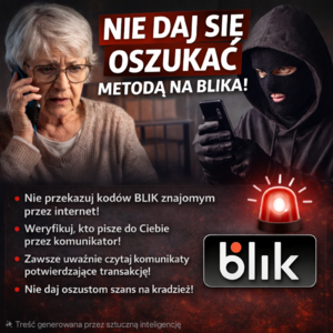 BLIK to szybka i bezpieczna forma płatności, jednak w ostatnim czasie stał się narzędziem wykorzystywanym przez oszustów. W ubiegłym tygodniu kolejne osoby powiadomiły nas o kilku przypadkach kradzieży pieniędzy z konta za pomocą wyłudzonych kodów płatności. Przestępcy podszywali się na portalach społecznościowych pod rodzinę lub bliskich znajomych, prosząc o pożyczkę pieniędzy, bo sprawa jest bardzo pilna. Za pomocą wyłudzonego kodu do płatności mobilnej okradali konto pokrzywdzonego! Apelujemy, aby nikomu nie udostępniać danych do kont bankowych.