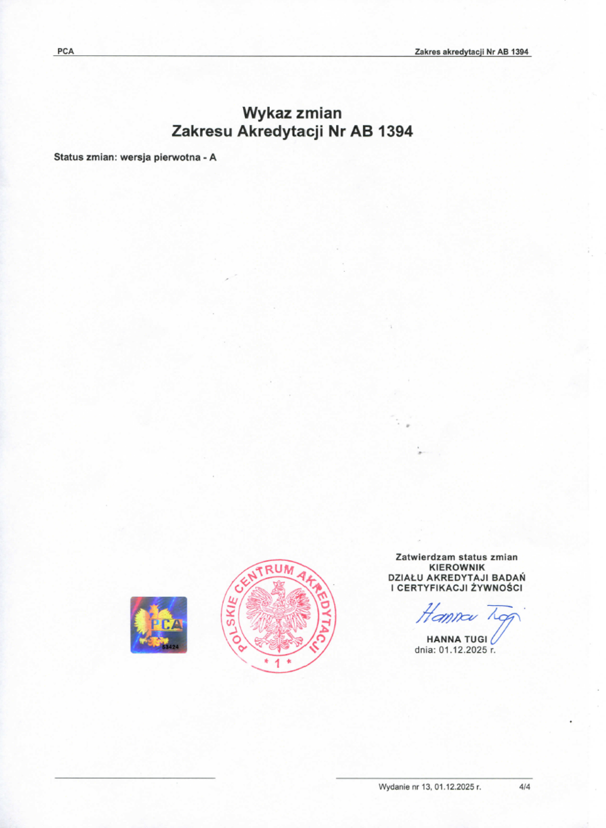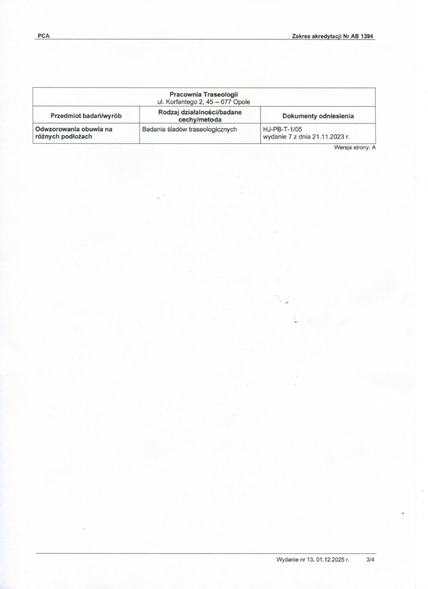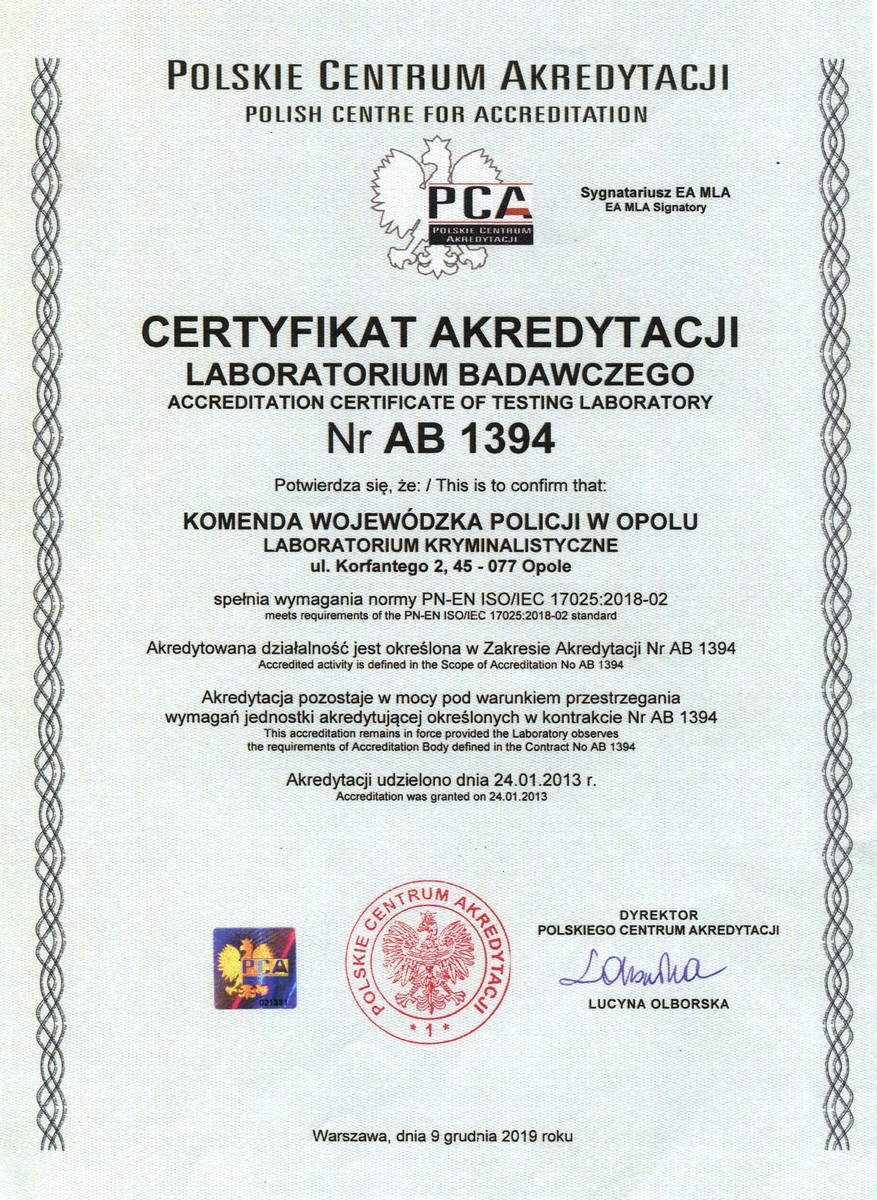 W styczniu 2013 r. Laboratorium uzyskało akredytację nr AB 1394 poświadczającą spełnienie wymagań normy PN-EN ISO/IEC 17025. W zakresie udzielonej akredytacji oprócz badań daktyloskopijnych (identyfikacja odwzorowań linii papilarnych oraz wizualizacja śladów daktyloskopijnych) znalazły się także badania śladów traseologicznych (śladów obuwia). W Polsce, oprócz opolskiego, tylko nieliczne laboratoria mogą poszczycić się tak znakomitym potwierdzeniem kompetencji metody badań śladów i spodów obuwia. Pozostałe obszary działalności LK nie są objęte wymaganiami ww. normy.