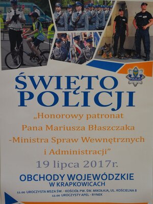 - Święto Policji na Opolszczyźnie 19 lipca na rynku w Krapkowicach odbędą się główne uroczystości związane z wojewódzkimi obchodami Święta Policji, które w tym roku patronatem honorowym objął Minister Spraw Wewnętrznych i Administracji Pan Mariusz Błaszczak. Policjanci odbiorą medale i odznaczenia, a także akty mianowania na kolejne stopnie służbowe. Na koniec odbędzie się występ w wykonaniu orkiestry policyjnej z Komendy Wojewódzkiej Policji w Katowicach. Mieszkańców naszego regionu serdecznie zapraszamy na tę uroczystość!
